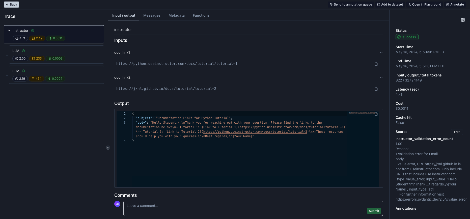 templated_inputsas inputs and the createdEmailobject as output - bottom of right sidebar: any validation errors are captured and tracked as score for the trace which enables visualizing them in dashboards and filtering by them on tables