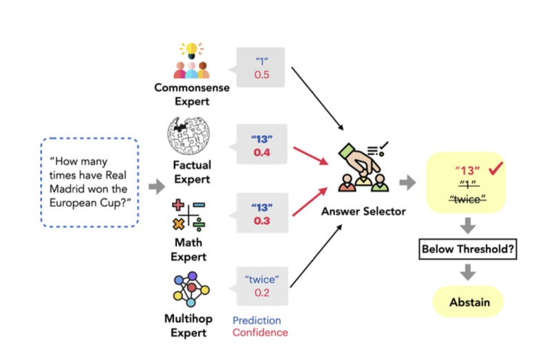 Once each expert has genearted a response, they then use a random forest classifier to score it from 0 to 1. This is then used for selecting the final answer and determining if we've generated a sufficiently good answer ( Since we have the option to abstain at each point )